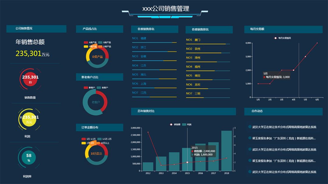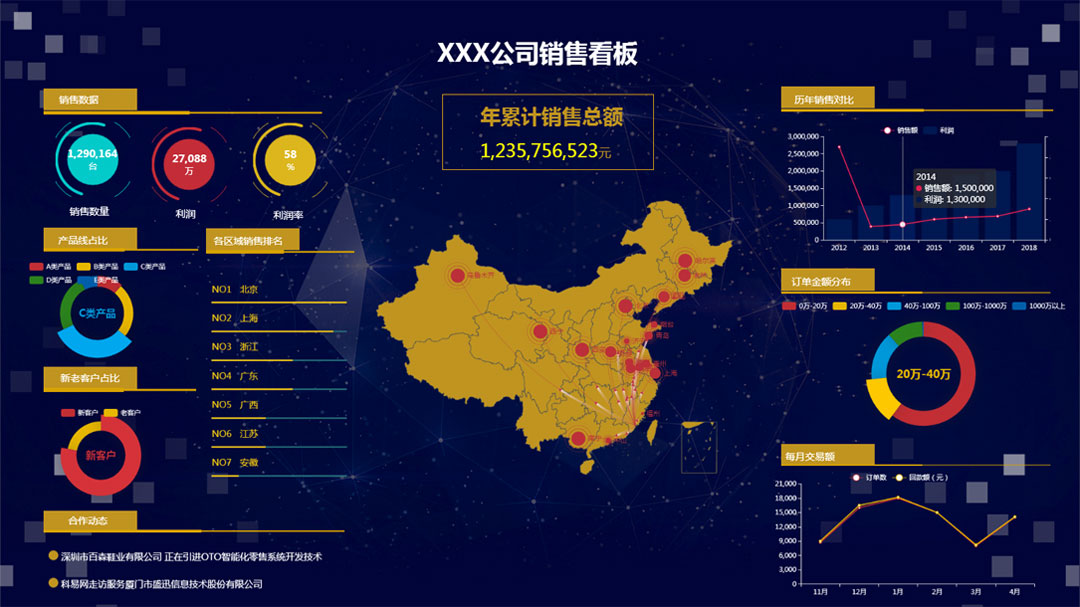 · 提供企业销售看板模板,多角度直观的了解企业销售情况,模板中的每个模块文字,数据都可按公司实际情况进行调整。