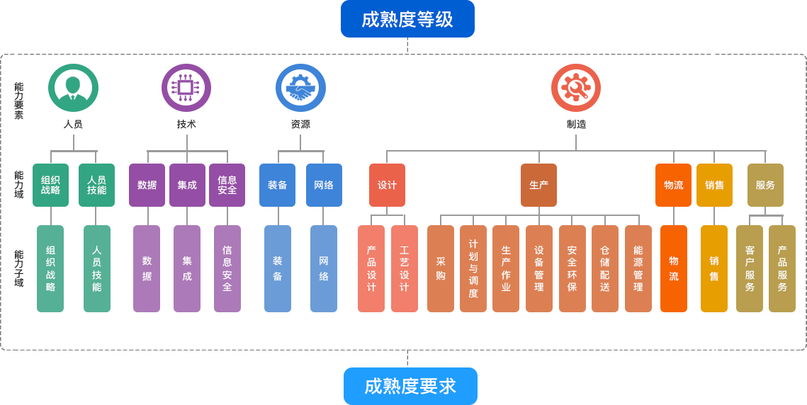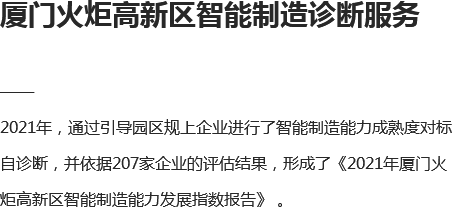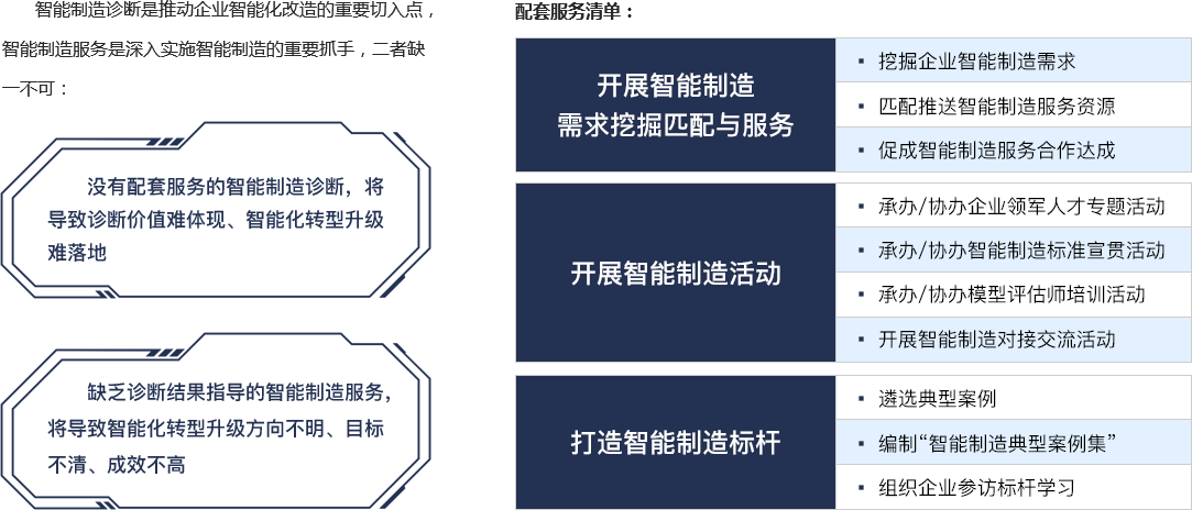 以政府集采方式,筛选重点工业企业提供智能制造诊断服务:基于《智能制造能力成熟度模型》和《智能制造能力成熟度评估方法》两项国家标准,从组织战略、数据集成、研发设计、装备网络、生产制造、物流管理、销售服务等多维度、多层次对企业智能化能力水平进行综合评价,帮助企业识别现状、发现短板、找到差距分析,确认下一步改进方向,持续提升企业智能制造能力。